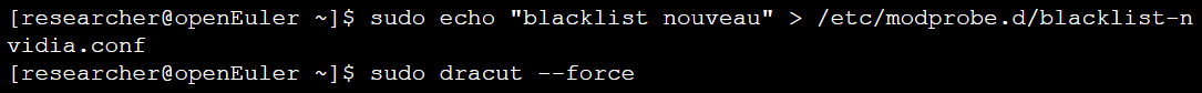 命令: sudo echo "blacklist nouveau" \> /etc/modprobe.d/blacklist-nvidia.conf sudo dracut --force