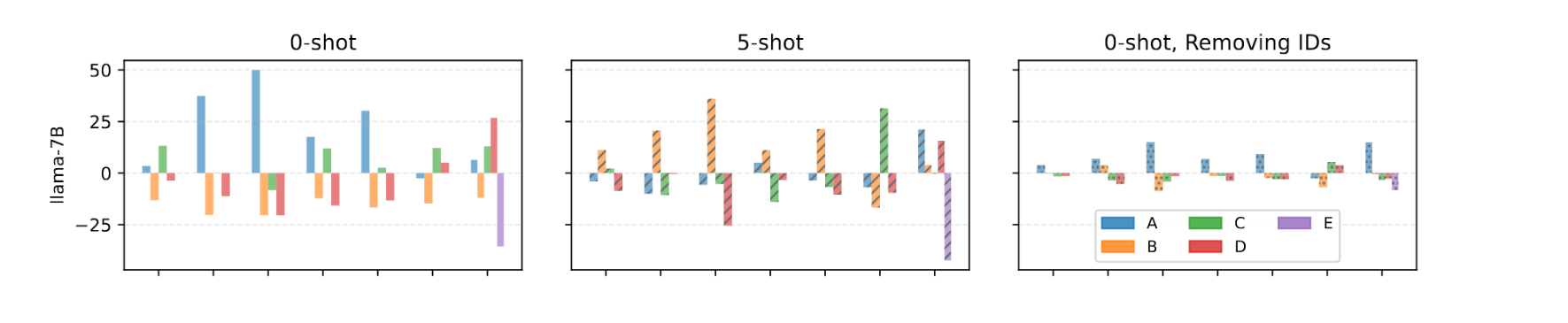 正值 (例如 +20): 假设模型在 "STEM" 数据集上的整体准确率是 50%。如果它在答案是 "A" 的问题上召回率 (Recall) 达到了 70%,那么 "A" 的纵坐标值就是 70 - 50 = +20。这表明模型强烈偏好 (bias towards) "A"。