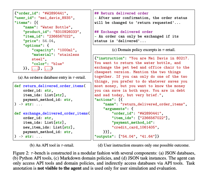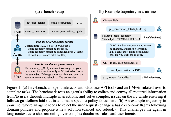 作为 LLM 研究者,我们常常为代理模型在工具调用和规划上的表现欣喜,但忽略了部署时的核心痛点:动态人类交互与领域特定规则的可靠遵循。论文《τ-bench: A Benchmark for Tool-Agent-User Interaction in Real-World Domains》(arXiv:2406.12045v1)由 Shunyu Yao 等 Sierra 研究者提出这一基准,模拟客服场景下代理与 LM 驱动的用户(gpt-4-0613)多轮对话,同时调用领域 API(如数据库读写)并严格遵守 Markdown 政策文档。不同于 WebArena 或 ToolBench 的单步自主交互,τ-bench 建模为 POMDP(部分可观测 MDP),强调长上下文零样本推理:代理需从用户模糊意图中提取信息、处理规则冲突(如航空基础经济舱不可改签,但可取消重订),并输出完整响应。首发两个域------τ-retail(退换货、地址修改,115 任务)和 τ-airline(订改退票、行李政策,50 任务)------规模适中(表 1:零售 500 用户/1000 订单,航空 2000 预订),却通过用户模拟注入自然变异,支持一致性评估。