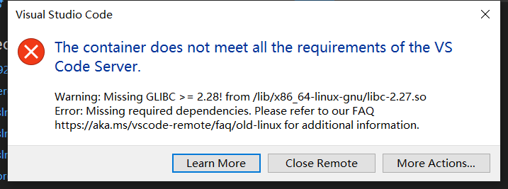 使用新版本的VSCode进行容器的远程连接时,会报如下图1-1所示的需要GLIBC >= 2.28的错误。解决方案也很明显,就是将GLIBC更新到2.28以上。