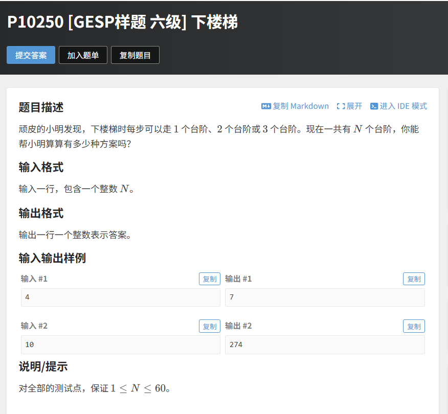 - 输入 4:输出 7(正确,因为 4 个台阶的方案有 1+1+1+1、1+1+2、1+2+1、2+1+1、2+2、1+3、3+1,共 7 种);