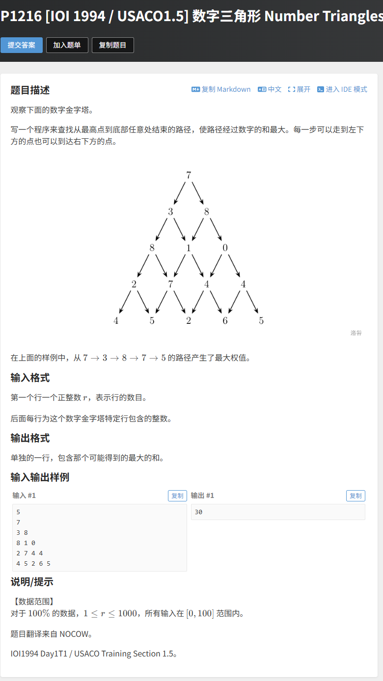 为了让大家更好地掌握动态规划的解题流程,这里再推荐1道入门必做的基础题------数字三角形。
