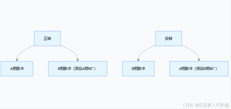 - 正转:A 相超前 B 相 90°(比如 A 相上升沿时,B 相为低电平);