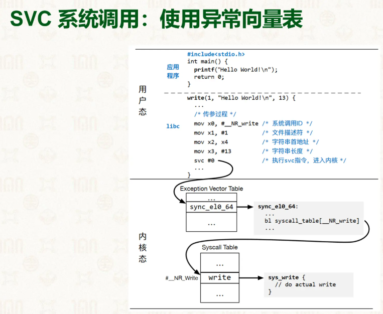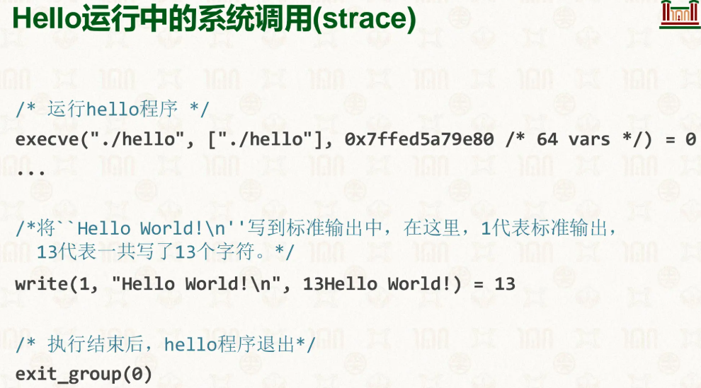 ➢ 例如:printf() -> write()->sys_write()• write(1, "Hello World!\n", 13)