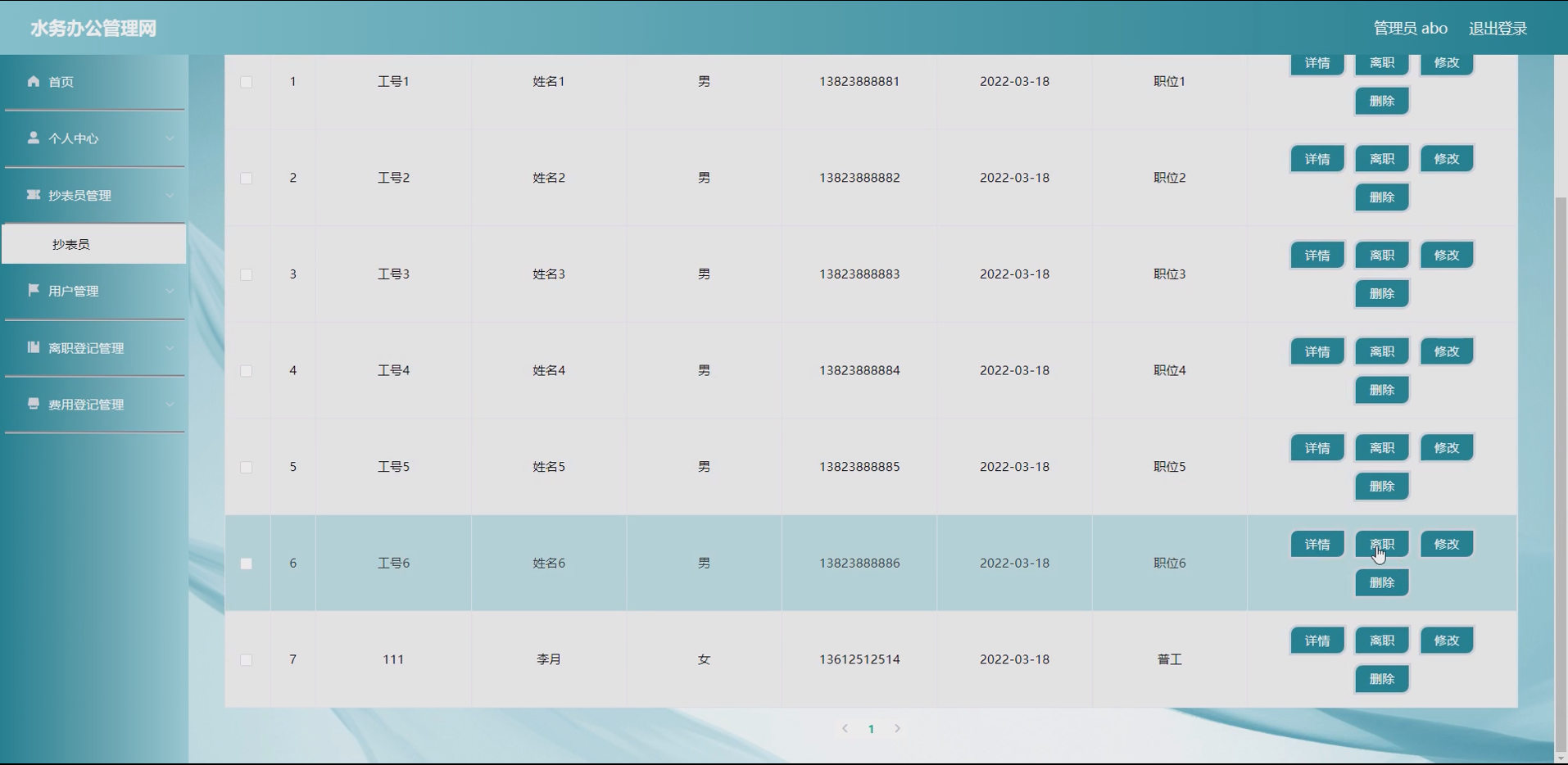 系统项目功能:抄表员,用户,离职登记,费用登记