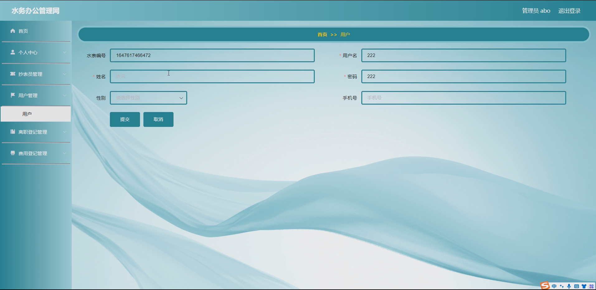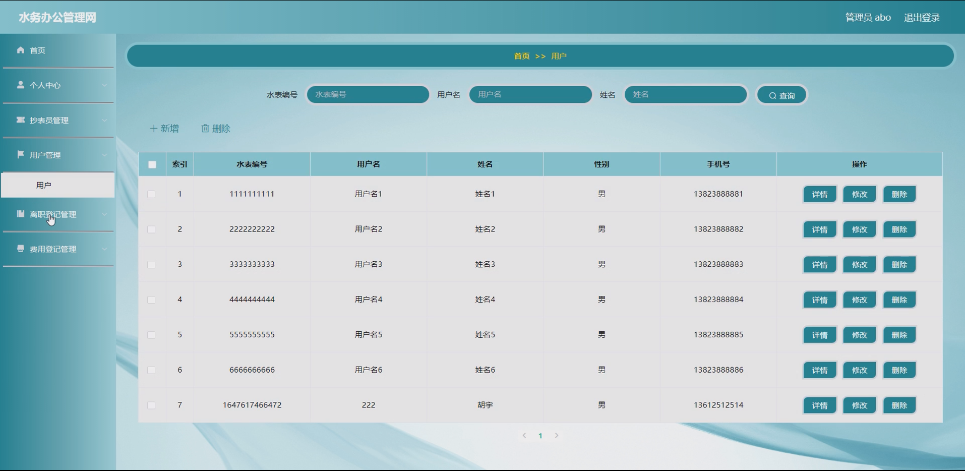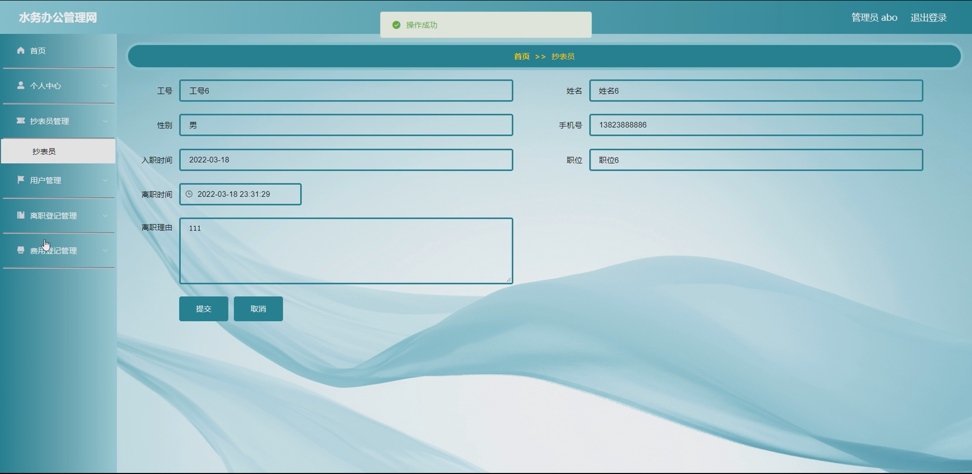 从实际应用意义来看,首先,该系统能够规范水务办公流程,将抄表、费用登记等工作流程标准化,减少人为操作失误,提高工作效率。其次,系统实现了用户信息、抄表数据、费用信息等的集中管理,便于工作人员快速查询、统计和分析相关数据,为水务企业的决策提供数据支持。再次,对于抄表员而言,系统可辅助其高效完成抄表任务,实时上传抄表数据;对于用户而言,可通过系统便捷查询自身费用信息,提升用户体验。最后,系统的离职登记功能能够规范员工离职流程,确保工作的顺利衔接,降低企业管理风险。