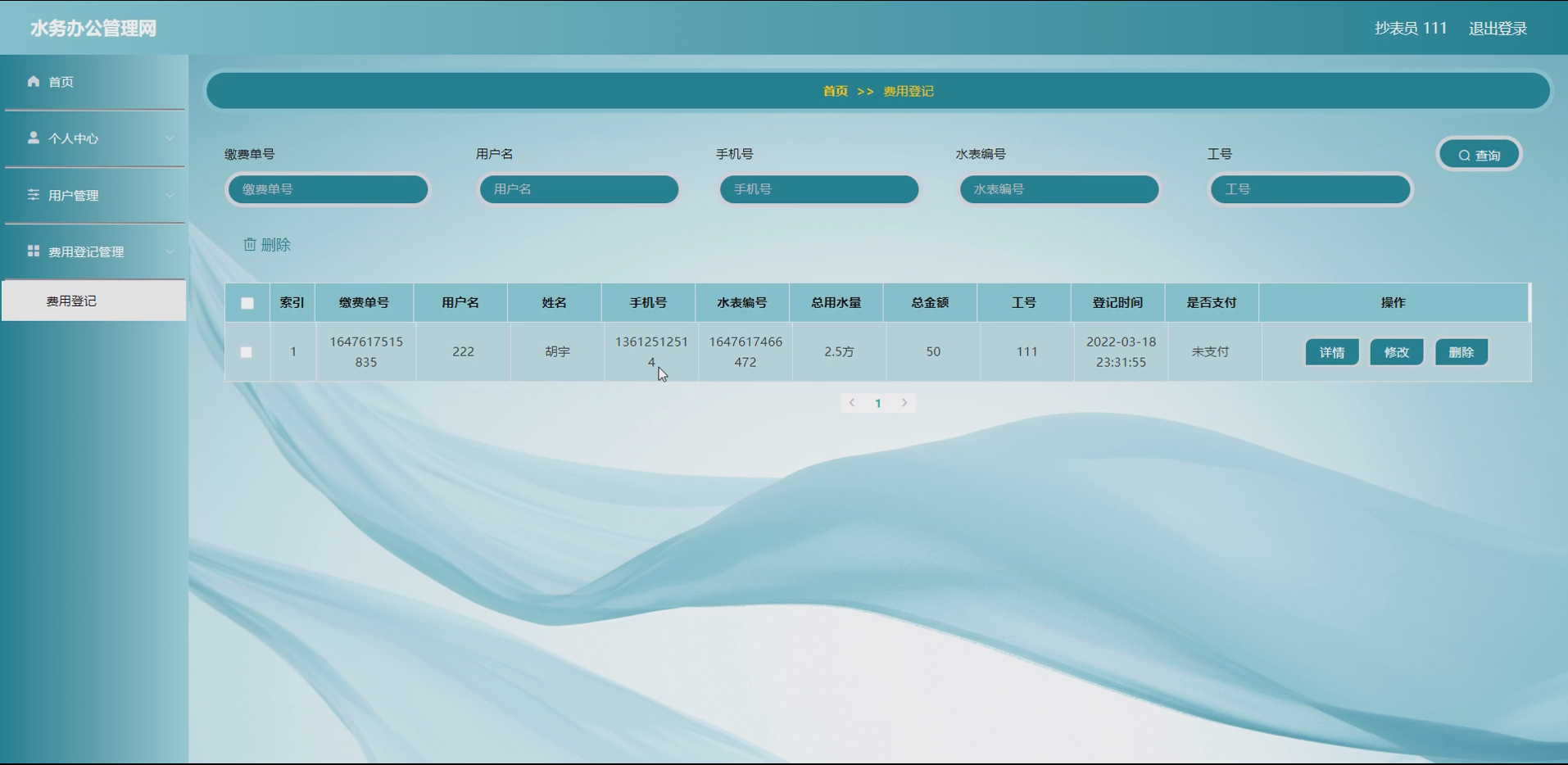 实现费用登记功能,基于抄表数据自动计算费用,支持费用录入、审核、修改,以及费用统计与查询等。