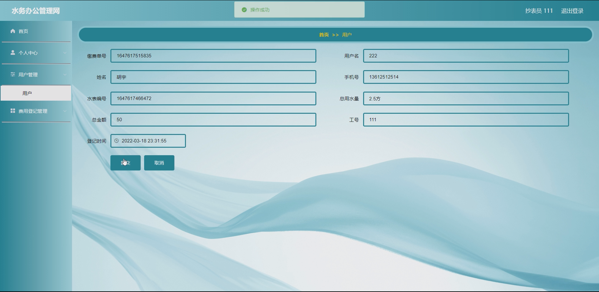 实现用户相关管理功能,支持用户信息注册、登录、查询、修改,以及用户用水信息查询、费用查询等。