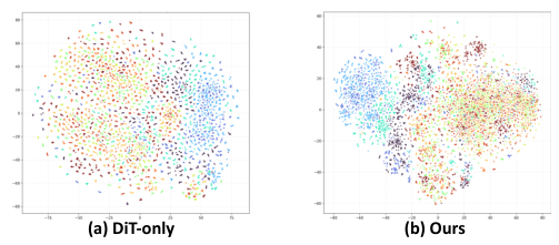 在特征空间的可视化(t-SNE)中,DiP表现出了更紧密的类内聚类和更清晰的类间分离。