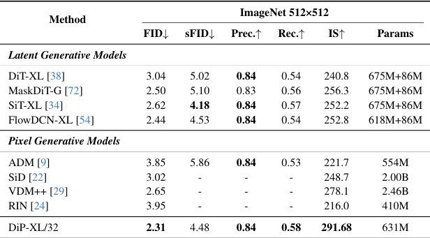 在ImageNet 512×512 分辨率下,DiP取得了2.31的FID分数。