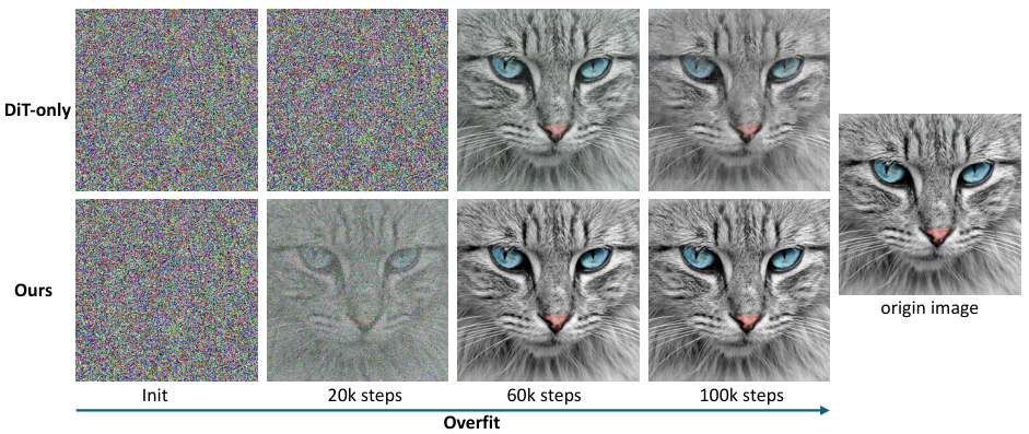 当在像素空间对单个高分辨率图像进行过拟合实验时,仅使用DiT的模型无法重建清晰的细节。