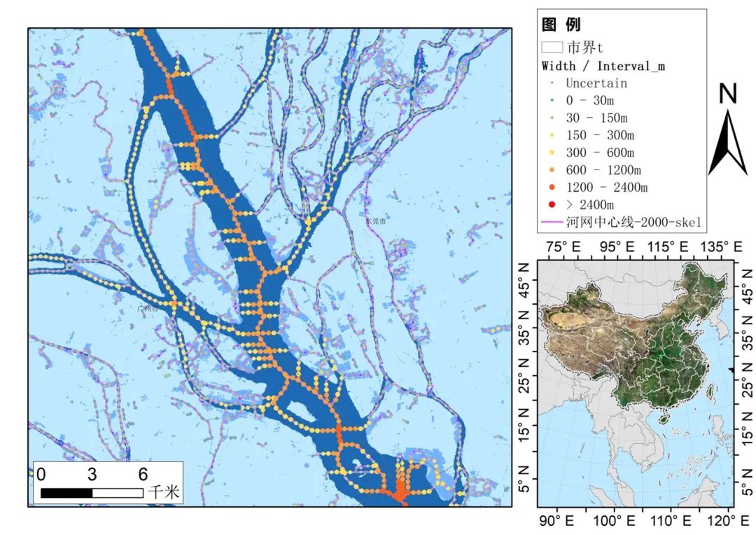 图4 河道中心点河宽矢量数据可视化示意图(广东珠江入海口局部)