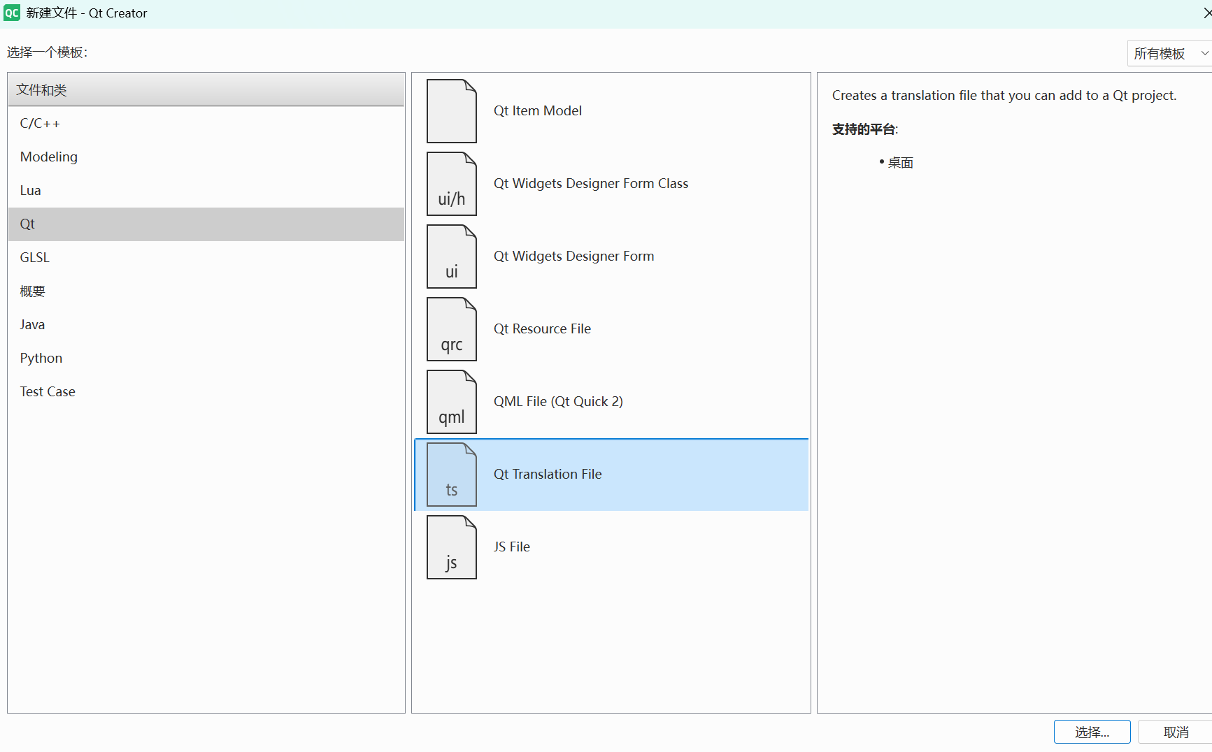我们首先创建一个 QTranslator类的对象,通过调用该类中的load函数将语音转化文件加载,该函数可以让工程自动定位到语音转化文件的位置以便于后续使用。对于该文件怎么来的下面我们来详细讲解一下。首先我们要通过新建文件,往工程内添加QT Translation file文件如下图所示: