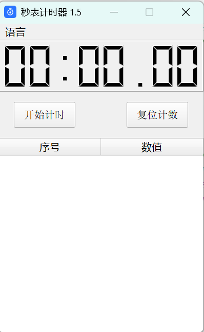 首先对数码管的显示进行了初始化通过display函数来让其显示该字符串。然后我们创建一个QTimer类的对象让指针指向该对象,该类中有与时间设置相关的函数,让该指针可以访问该类中的成员函数。然后通过函数connect将到达时间与到达时间的处理函数来连接起来,即我们定义的槽函数,该函数的参数第一个是发送信号者,第二个是发送的什么信号,第三个是接收信号者,第四个是对该信号处理的槽函数。然后我们再创建一个QStandardItemModel类的对象,让model指针指向该对象,该类是标准列表模式的类用来保存列表数据。然后我们同过model指针来色湖之该数据模型即保存列表数据的头数据,即我们要显示的秒表记录数据的说明。然后通过setModel函数将该列表数据设置到我们的列表显示控件中,即将显示模型与数据模型关联起来。因为默认该列表数据的头宽度是可以进行调整的,所以我们将其默认值通过函数设成默认值让其不可调整。并通过setHidden将竖直的头设置为隐藏。并设置该列表显示为只读不能修改,因为该软件就是对时间的记录,不需要对记录的数据进行修改。然后设置选中为选中一行有更好的显示。完成这些初始化后我们的界面如下: