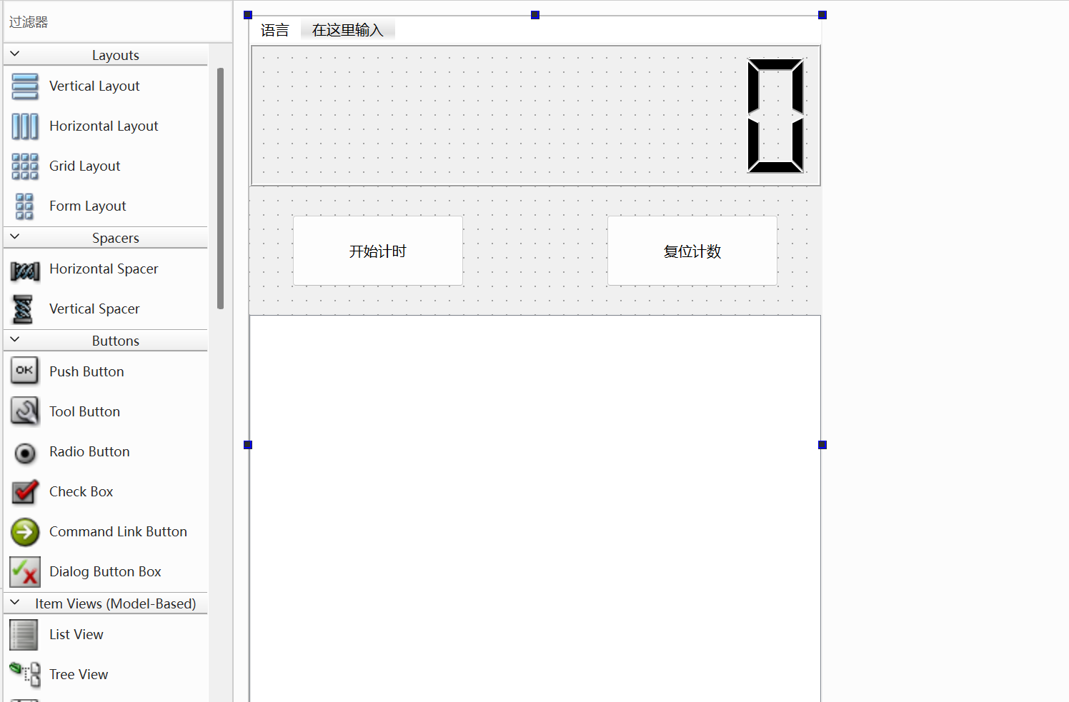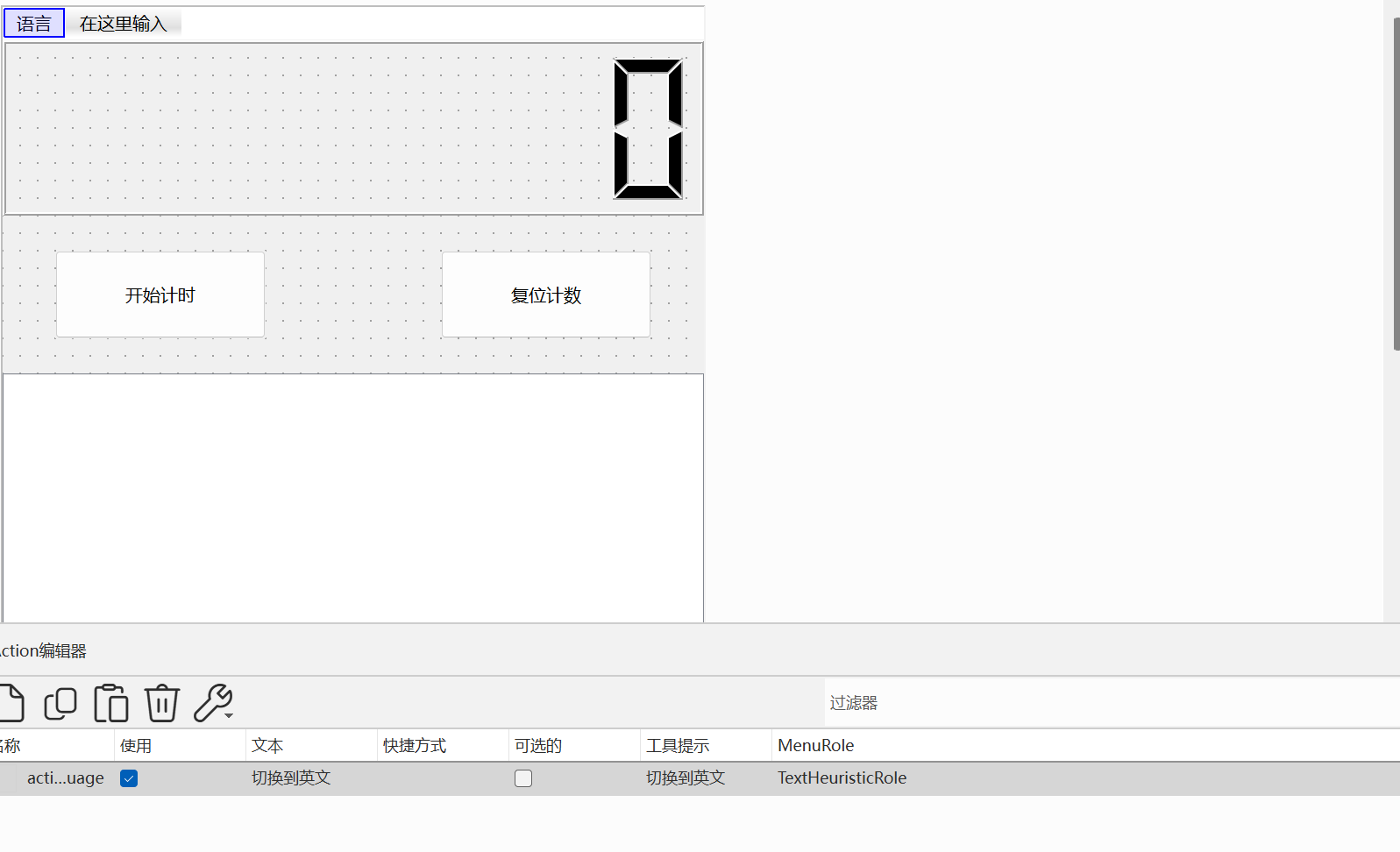 首先我们在创建文件是要选择窗体为主窗体,选择了主窗体之后我们才能编辑左上角的工具栏,这里我们的工具栏要设置的功能就是语言转化功能。然后上面选择的控件是LCD Number即数码管显示通过数码管来显示我们要计数的时间,数码管对象属性的设置如下: