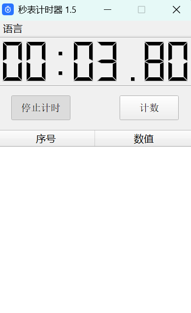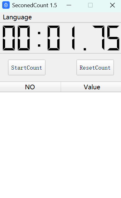 在该控件的槽函数中我们首先通过一个变量来保存了进入该槽函数是按键状态的布尔值,这个值在后会有用到。然后我们判断传入参数的bool值来判断该按键否被按下。当按下时我们通过start函数开始时间并通过判断语言类型来对该控件文本进行不同语言的显示,当判断状态没有在按下状态时我们就停止计时,来通过该按键对时间开始和停止进行控制,实现效果如图: