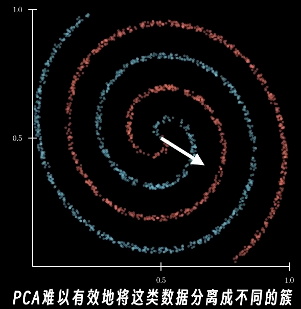 PCA是线性的,因此在非线性的数据分布上得到的结果不好