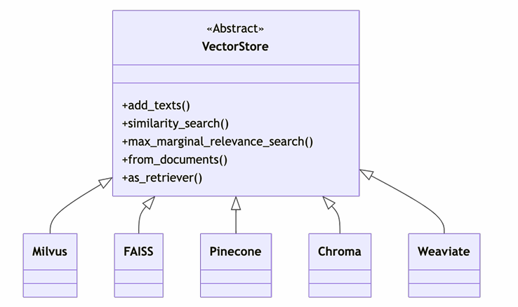 - 插件化实现:具体的向量数据库(如Milvus)通过实现VectorStore的抽象方法,适配自身的底层API,LangChain负责统一调度。