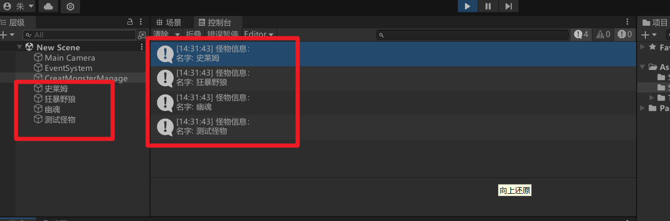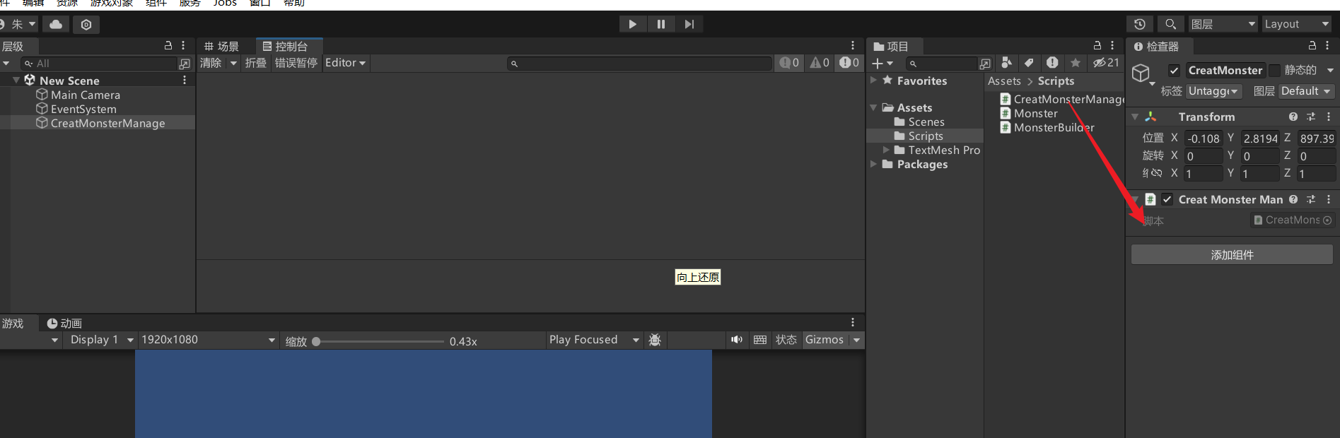 最后将CreatMonsterManage添加到场景中的一个空对象上然后运行游戏即可。