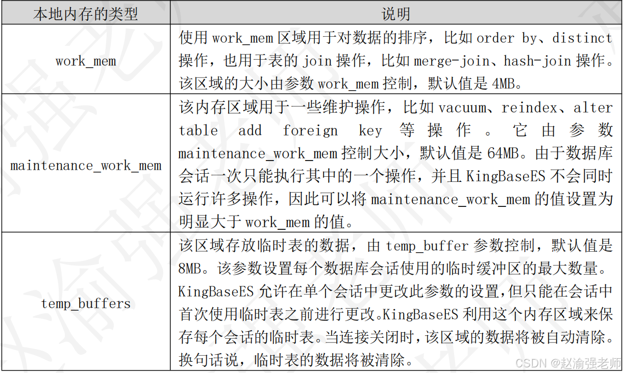 金仓数据库的本地内存是指每个后台进程(backend process)自己使用的内存区域,下表列举了KingBaseES中的本地内存以及它们的作用。