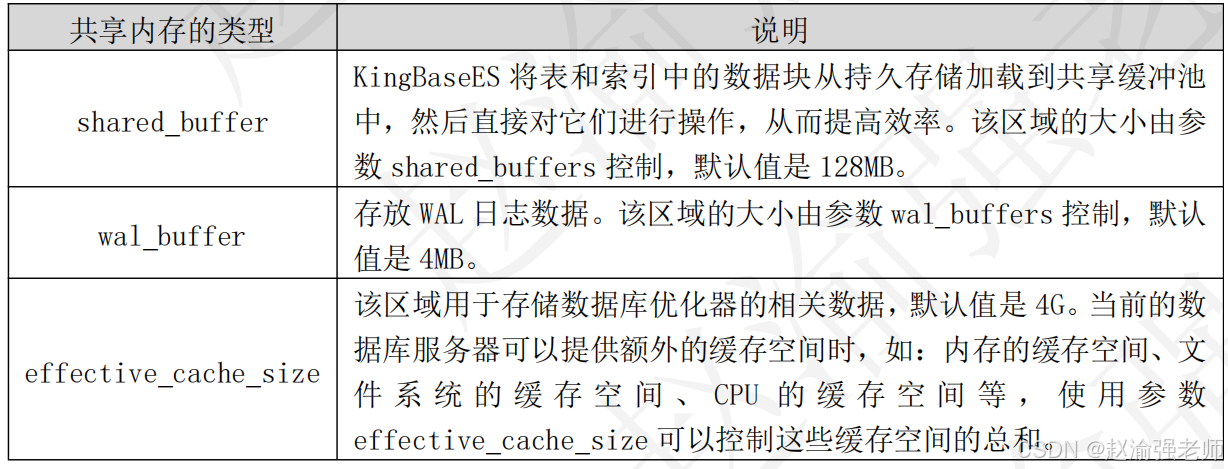金仓数据库的共享内存是指每个后台进程(backend process)共同使用的内存区域,下表列举了KingBaseES中的共享内存以及它们的作用。