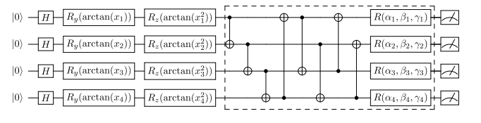 - 数据编码层,将经典输入向量 v ⃗ \vec{v} v 编码为量子态。使用 H 门制备叠加态后,通过旋转门 R y R_y Ry 和 R z R_z Rz 进行编码,角度由输入数据及其平方值的反正切函数决定。