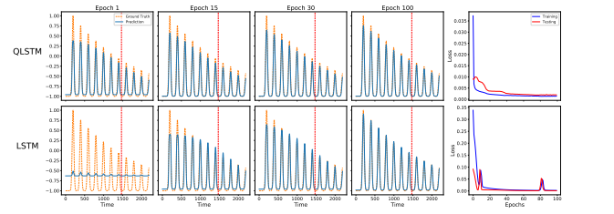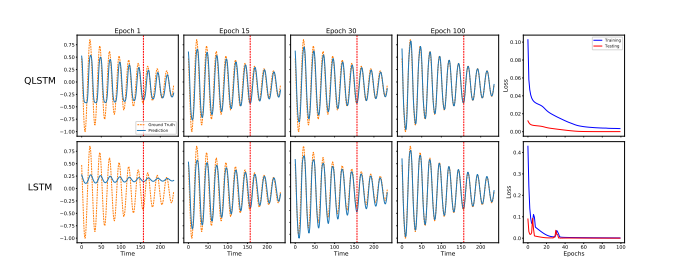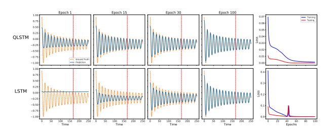 实验二:在预测阻尼谐振子角速度的任务中,QLSTM 不仅收敛更快,而且在极值点处的拟合更加温和精准,避免了经典 LSTM 容易出现的过冲现象。
