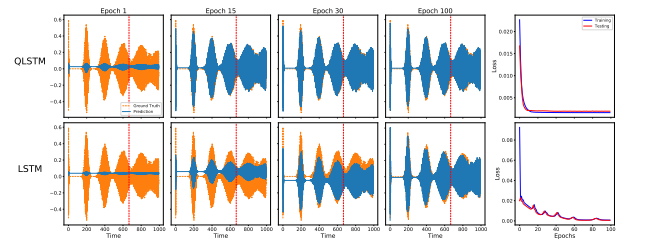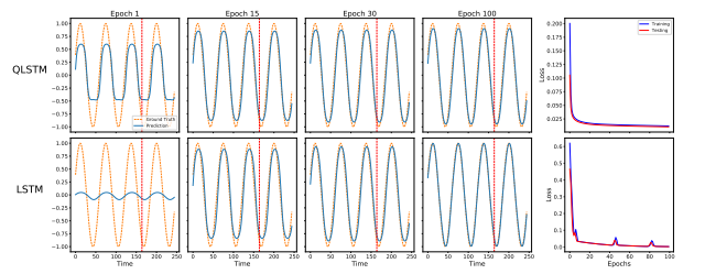 为了公平比较,作者构建了参数量相近的经典 LSTM与 QLSTM进行对比,实验基于 PyTorch 和 PennyLane 模拟环境。