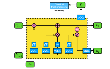 QLSTM 单元通过堆叠多个 VQC 构建而成。如下图所示,黄框部分为单元主体,蓝色小块即为上述的 VQC 模块。