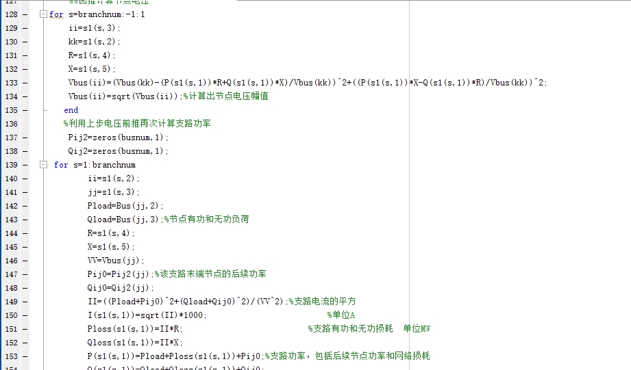 这段代码首先初始化了节点数、电压初值、负荷功率、收敛容差以及最大迭代次数等参数。然后在循环中,通过前推和回代的过程逐步更新节点电压,每次迭代后检查电压的变化量是否小于收敛容差,以此判断是否收敛。如果在最大迭代次数内收敛,就输出各节点电压幅值,要是没收敛也会给出提示。