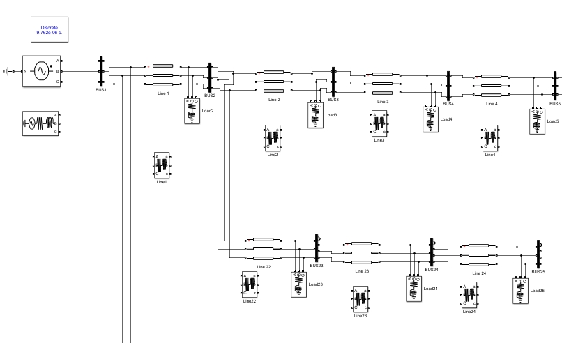 IEEE33节点配电网模型,附带有详细节点数据以及文献出处来源,MATLAB,simulink各个版本均可运行,可以进行潮流计算以及四种常见故障波形仿真,可以更换线路模型,分布参数模型用于故障仿真(50km线路阻抗数据已经计算完毕,帮助节约大量时间更换模型),集中参数模型用于潮流计算。 附带前推回代法潮流计算程序(带注释),另外还有故障诊断模型以及各种故障数据, 本人只提供模型和介绍用法