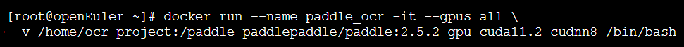 创建一个交互式容器,并将宿主机的项目目录(例如/home/ocr_project)挂载到容器内部的/paddle目录,方便进行代码开发和数据交互。--gpus all参数使得容器可以访问宿主机的所有GPU资源。