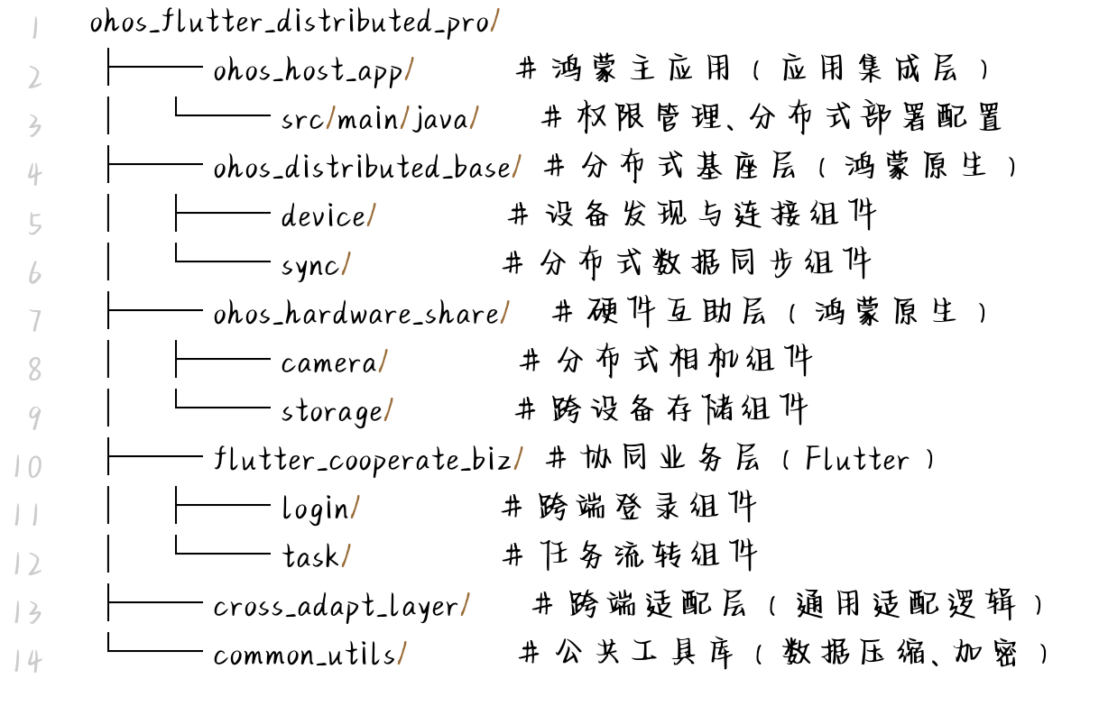 在全场景智慧生态加速渗透的当下,用户对应用的需求已从"单设备可用"升级为"多设备无缝协同"------文件跨端流转、任务断点续传、硬件能力互助等场景成为核心诉求。开源鸿蒙(OpenHarmony)的分布式技术栈(软总线、数据管理、设备组网)提供了全场景协同的底层基座,而Flutter的跨端一致性渲染、组件化高效开发优势,为多设备适配提供了效率保障。二者深度融合,通过"分布式能力组件化封装、跨端协同接口标准化、业务场景模块化拆分"的创新思路,打破传统跨端应用"协同能力弱、设备联动难、开发成本高"的痛点,实现"一次开发、多端部署、全场景协同"的核心目标。本文从架构升级、核心实现、优化策略到工程化落地,结合极简代码示例,拆解一套更具扩展性的分布式跨端开发方案。