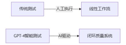 传统测试遵循"开发---测试---修复"的线性流程,而GPT-4赋能的智能测试平台实现了以下能力: