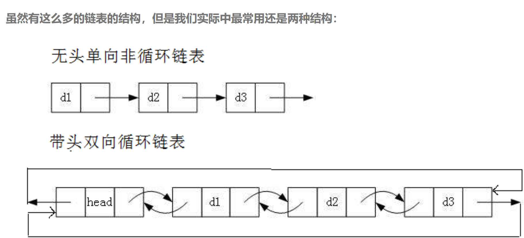 都是带头双向循环链表。另外这个结构虽然结构复杂,但是使用代码实现以后会发现结构会带来很多优势,实现反而简单了,后面我们代码实现了就知道了。