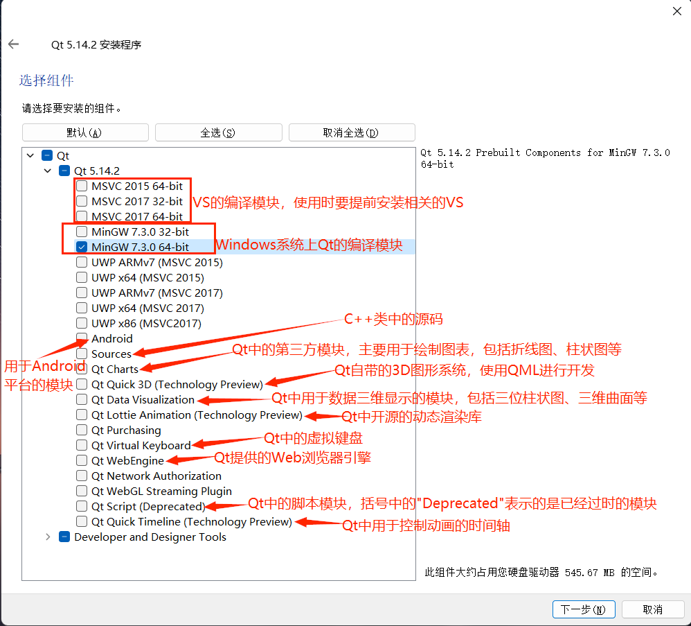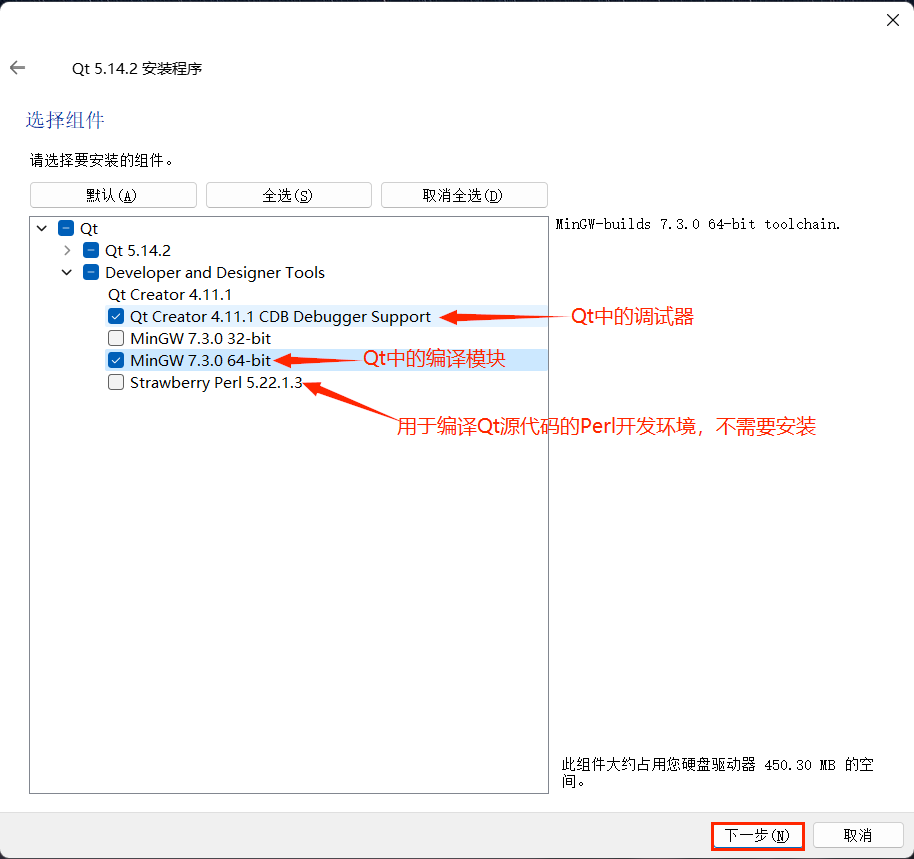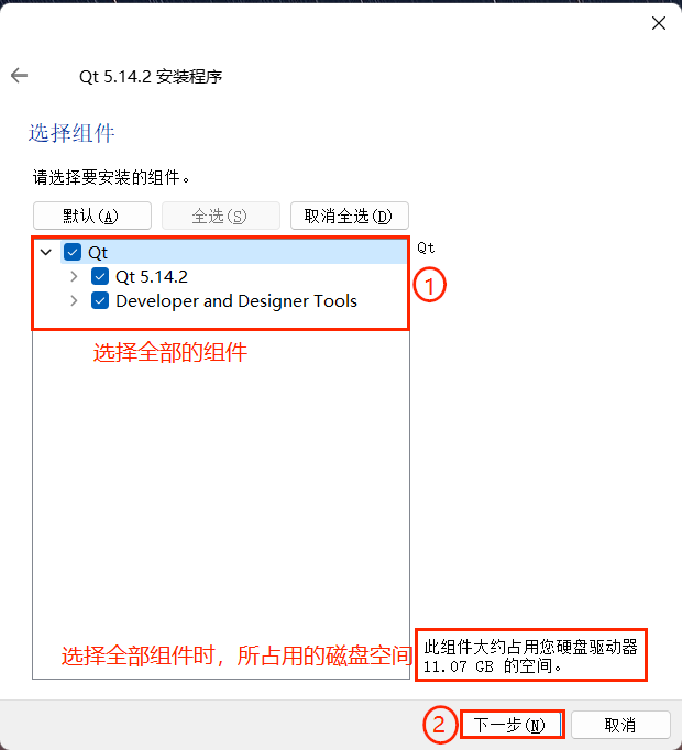 - 选择安装组件;这里我们安装的是Qt Creator。如果电脑磁盘空间允许,建议全选以便后续使 用,如果空间不允许,请看第5步;