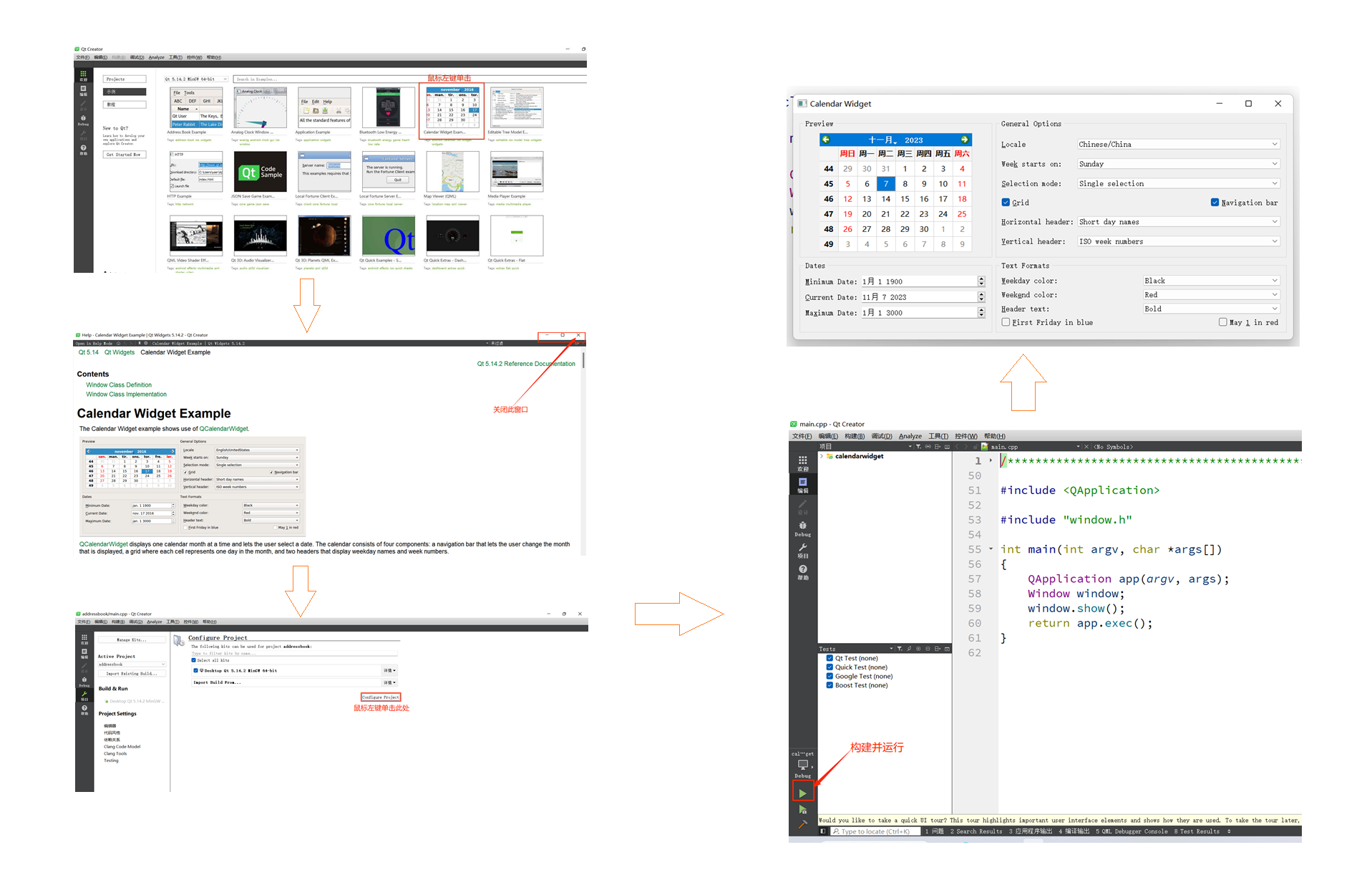 在"示例"中任选其中一个,单击打开该示例。在单击之后会弹出⼀个窗口,关闭即可 ;如果能构建并运行,说明安装无误