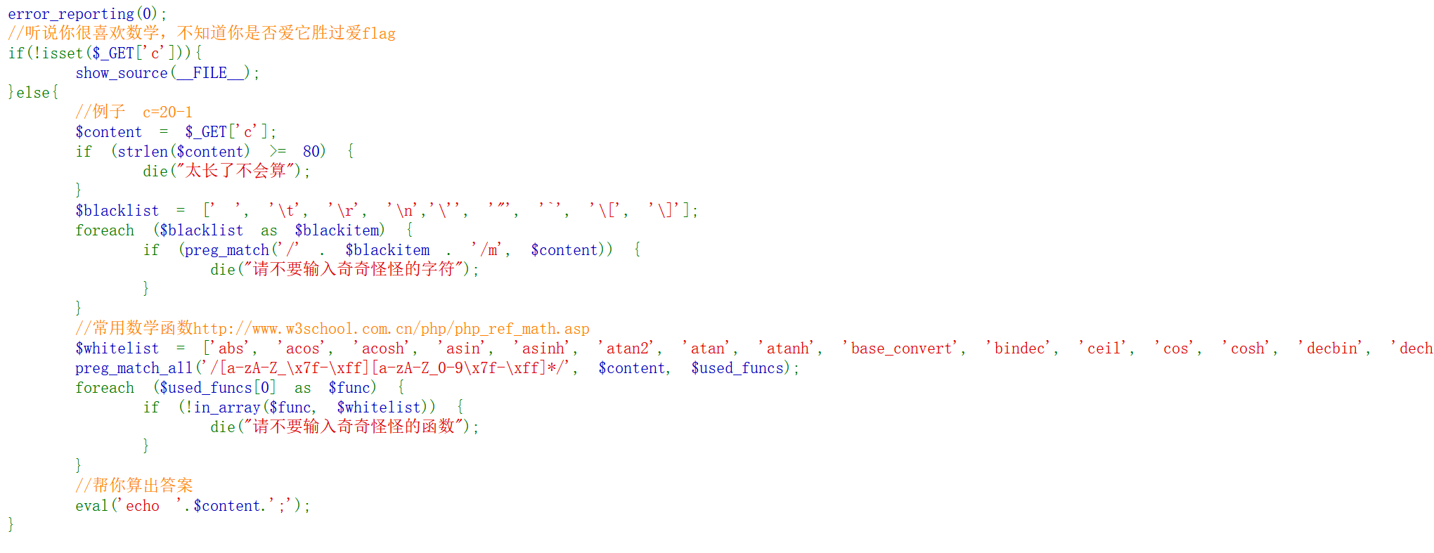 什么叫白名单,就是只允许你使用这些函数,其他函数不允许。这里允许的函数是一一堆数学函数,其中藏着几个比较特殊的函数(不是单纯的数学函数)