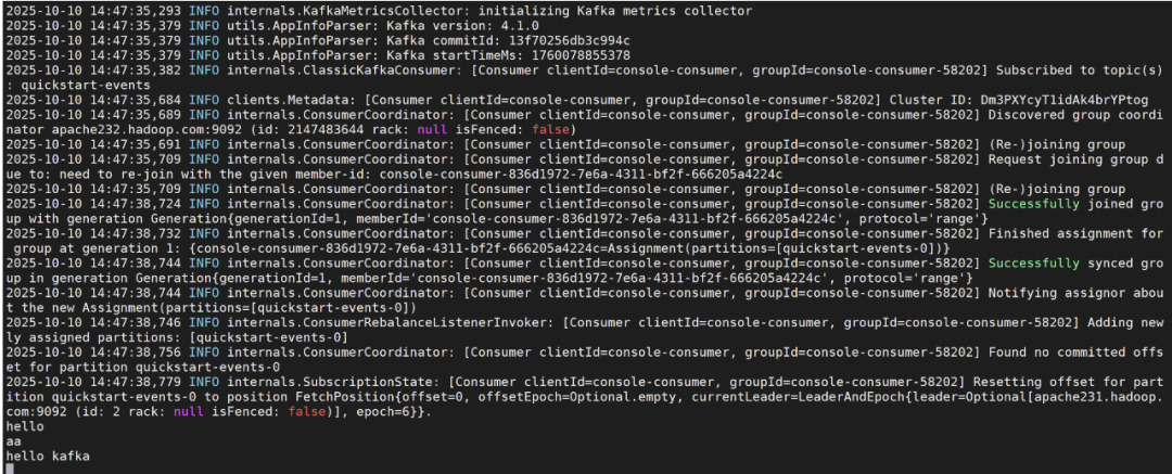 #消费者bin/kafka-console-consumer.sh --topic quickstart-events --from-beginning --bootstrap-server apache232.hadoop.com:9092