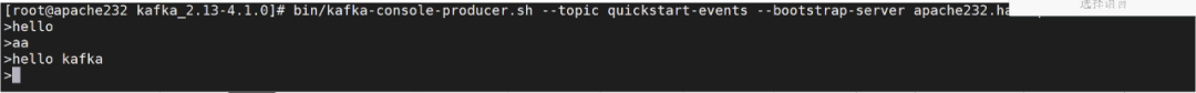 #生产者bin/kafka-console-producer.sh --topic quickstart-events --bootstrap-server apache232.hadoop.com:9092
