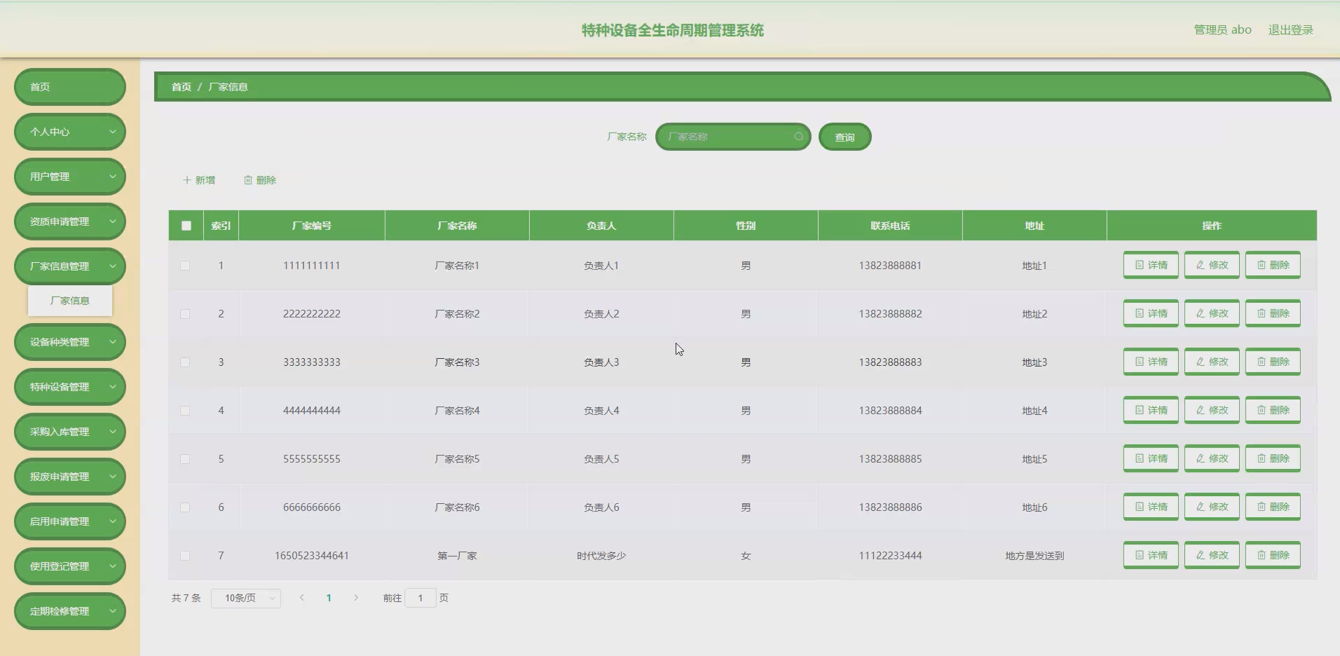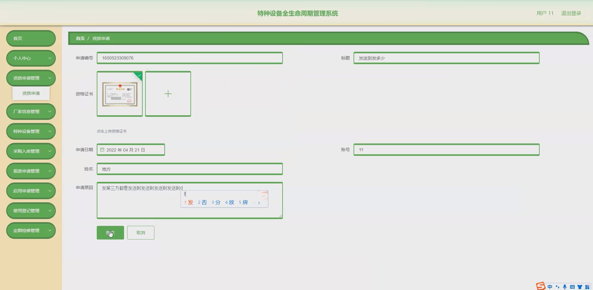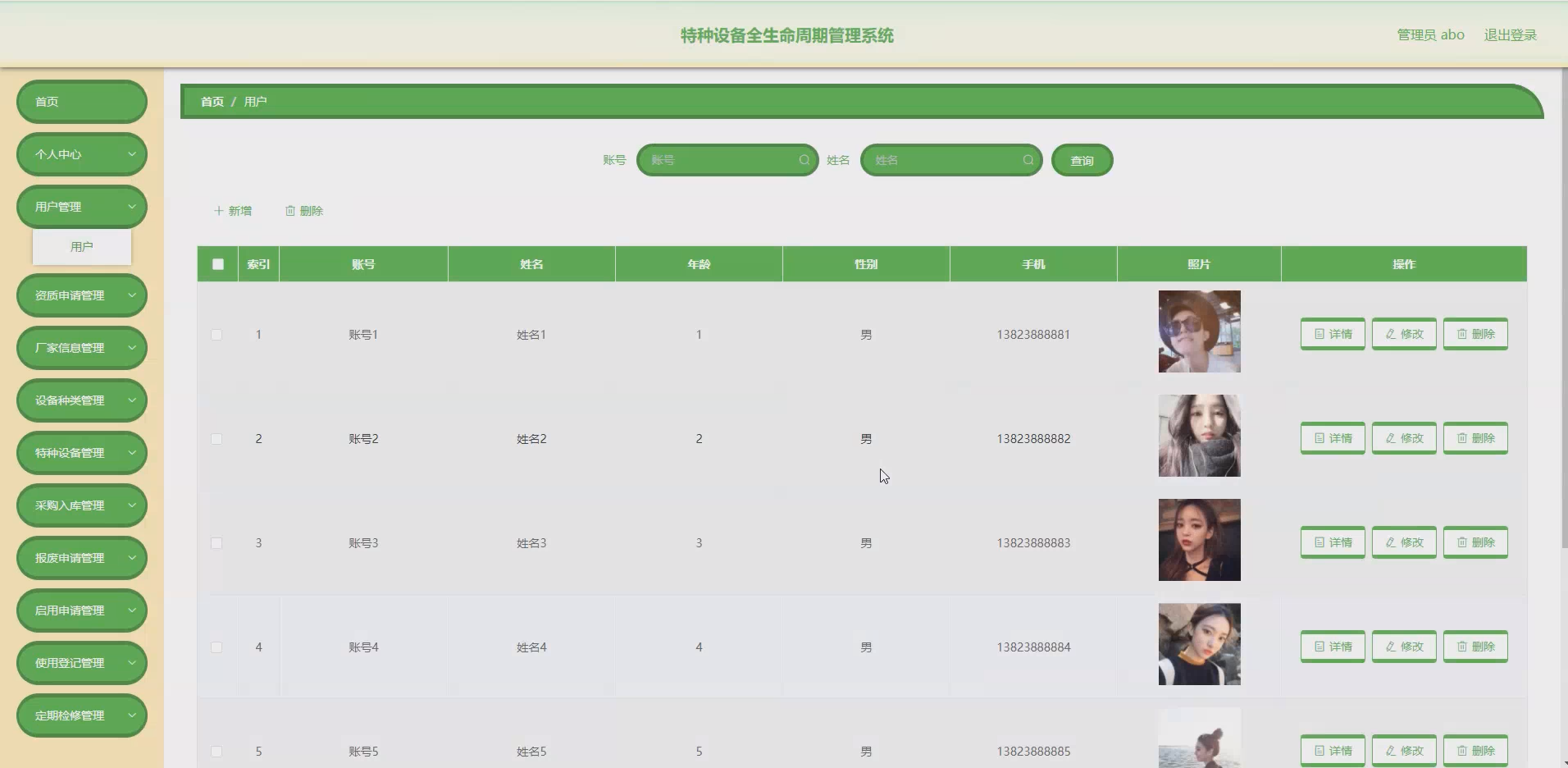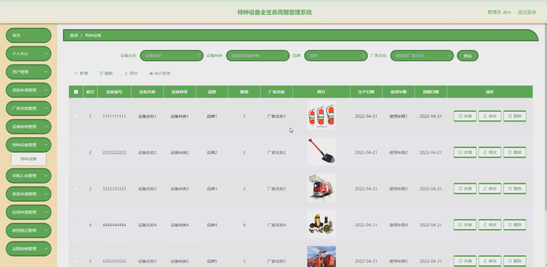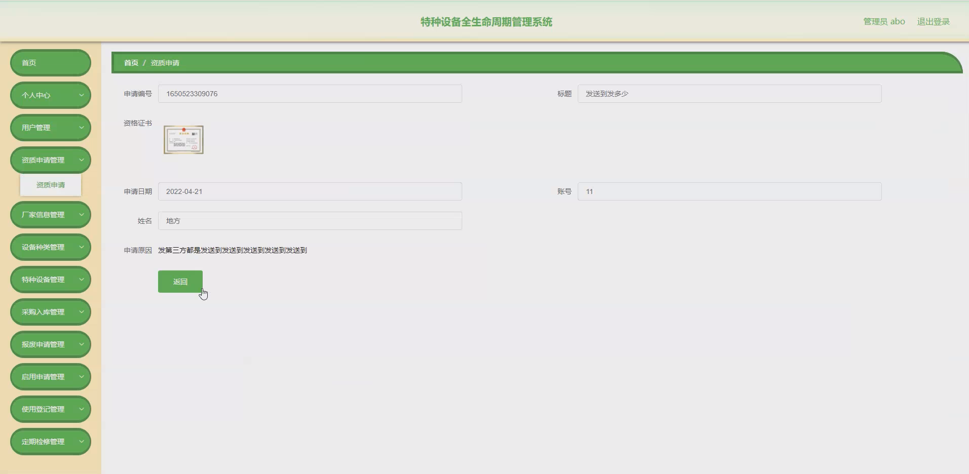系统项目功能:用户,资质申请,设备种类,特种设备,厂家信息,采购入库,使用登记,报废申请,定期检修,启用申请,检修人员