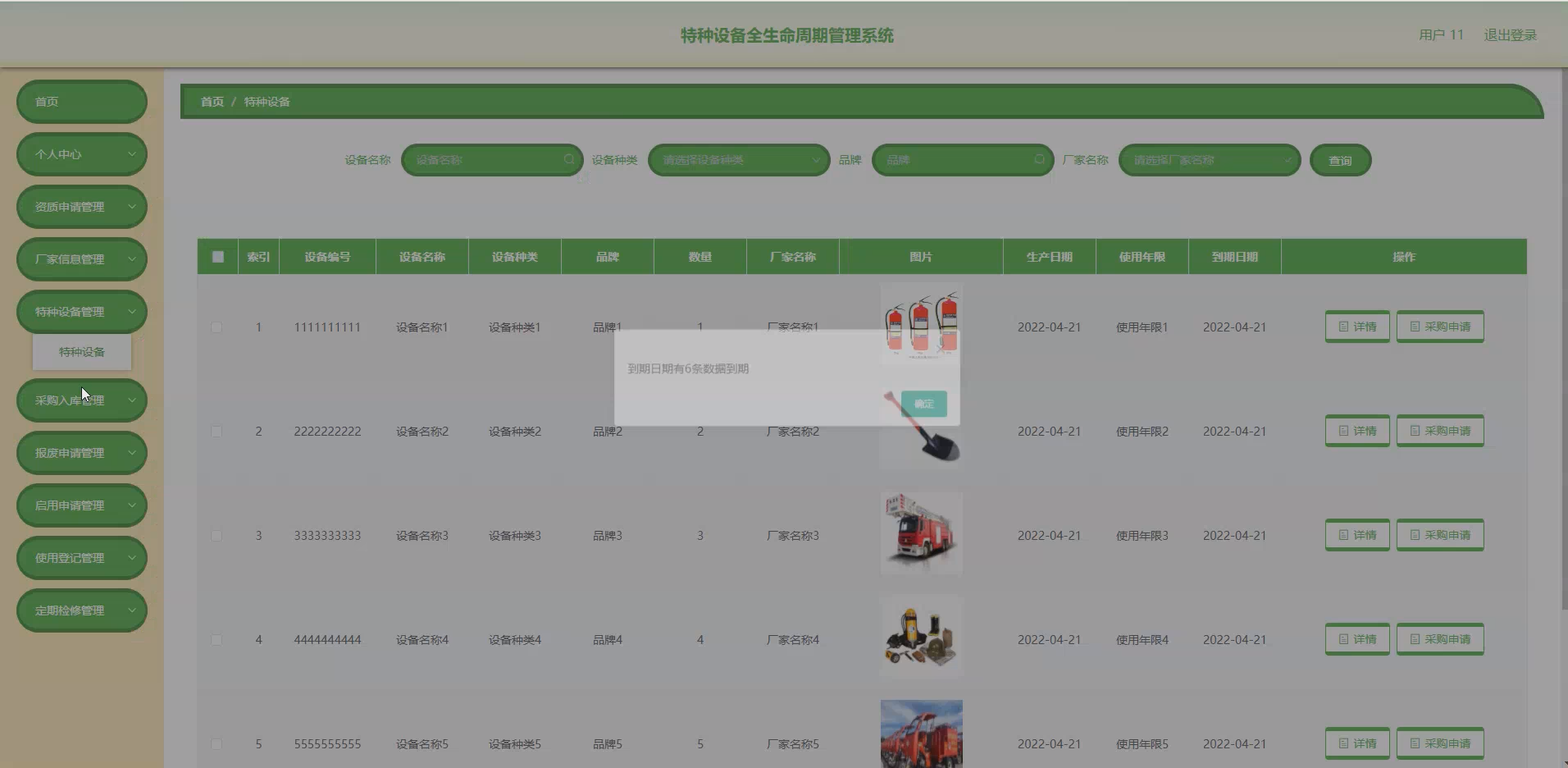实现特种设备全生命周期各环节的规范化操作,包括设备种类划分、采购入库登记、使用登记备案、定期检修安排、报废申请审批等;