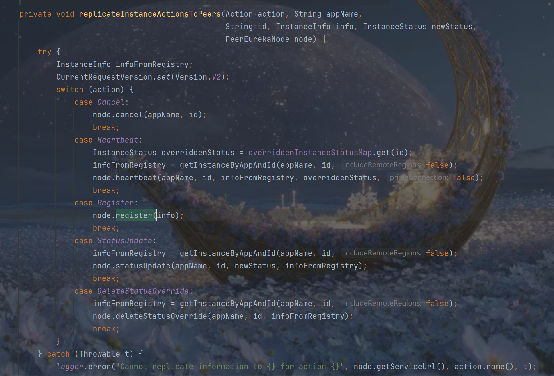 replicateToPeers(Action.Register, info.getAppName(), info.getId(), info, null, isReplication);