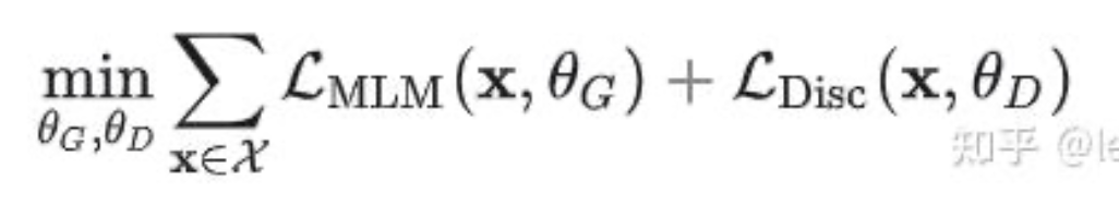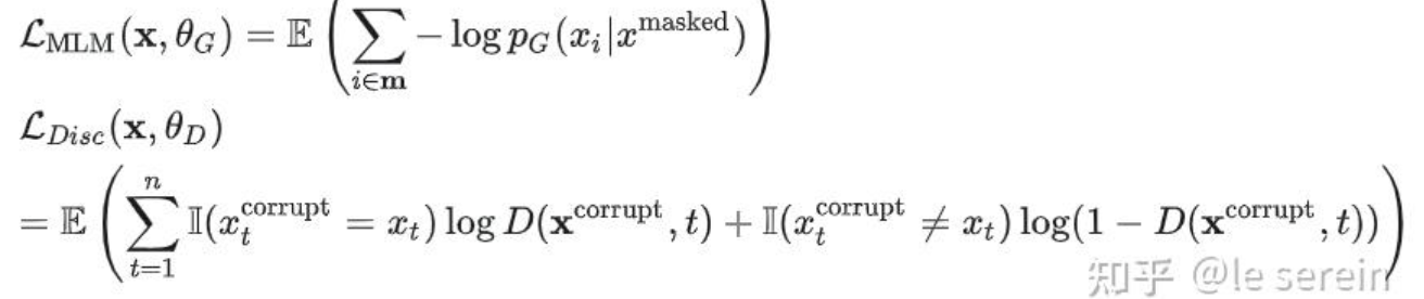 - 损失函数:由MLM(多元交叉熵损失)和判别任务(二元交叉熵损失)组成: