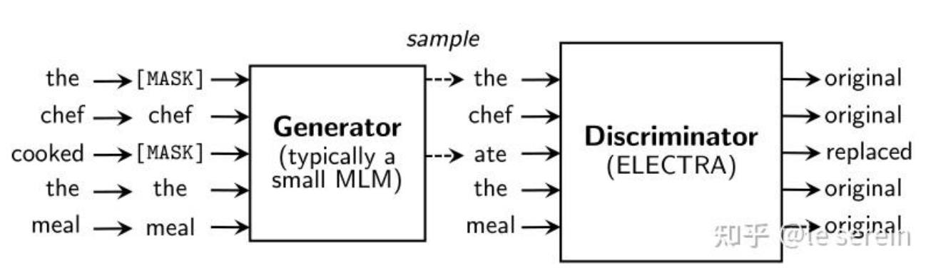 - 替换标记检测任务(RTD) :生成器(小型MLM模型)替换部分输入掩码,然后判别器判断每个掩码是否被替换。