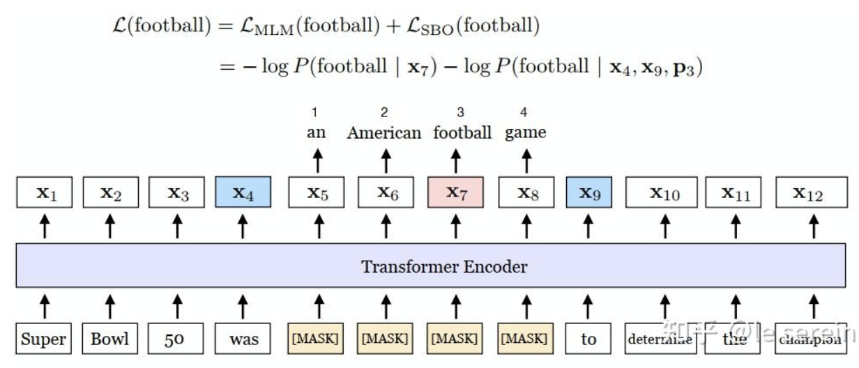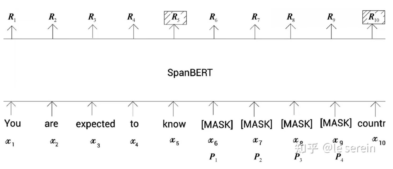 - 区间边界目标(Span Boundary Objective , SBO):预测被掩码跨度的起始和结束位置,强化跨度感知能力。