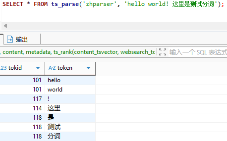 SELECT * FROM ts_parse('zhparser', 'hello world! 这里是测试分词');