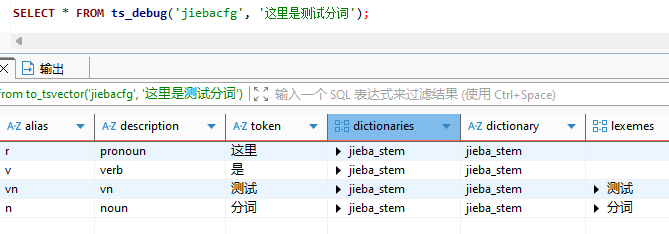 SELECT * FROM ts_debug('jiebacfg', '这里是测试分词');